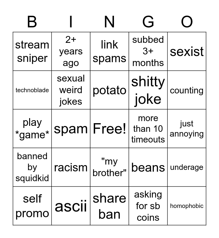 This bingo card has a free space and 24 words: racism, ascii, potato, self promo, sexist, stream sniper, technoblade, 2+ years ago, more than 10 timeouts, "my brother", shitty joke, play *game*, beans, underage, sexual weird jokes, asking for sb coins, just annoying, link spams, counting, spam, homophobic, banned by squidkid, subbed 3+ months and share ban.