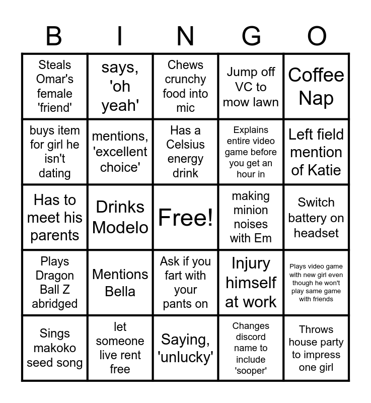 This bingo card has a free space and 24 words: Mentions Bella, let someone live rent free, Has a Celsius energy drink, Sings makoko seed song, Coffee Nap, Steals Omar's female 'friend', buys item for girl he isn't dating, says, 'oh yeah', making minion noises with Em, Ask if you fart with your pants on, Explains entire video game before you get an hour in, Has to meet his parents, Injury himself at work, Plays video game with new girl even though he won't play same game with friends, mentions, 'excellent choice', Changes discord name to include 'sooper', Switch battery on headset, Chews crunchy food into mic, Left field mention of Katie, Drinks Modelo, Throws house party to impress one girl, Plays Dragon Ball Z abridged, Jump off VC to mow lawn and Saying, 'unlucky'.