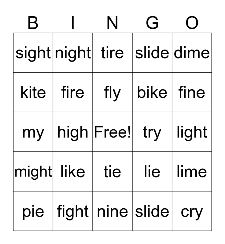 This bingo card has a free space and 24 words: like, fight, fly, pie, dime, sight, kite, night, try, tie, bike, my, lie, lime, fire, slide, light, tire, fine, high, cry, might, slide and nine.