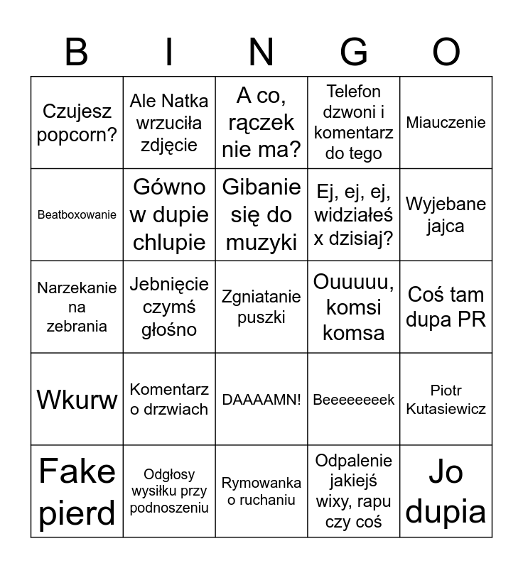 This bingo card has 25 words: Komentarz o drzwiach, Rymowanka o ruchaniu, Gibanie się do muzyki, Fake pierd, Miauczenie, Czujesz popcorn?, Beatboxowanie, Ale Natka wrzuciła zdjęcie, Ouuuuu, komsi komsa, DAAAAMN!, Ej, ej, ej, widziałeś x dzisiaj?, Narzekanie na zebrania, Beeeeeeeek, Piotr Kutasiewicz, Gówno w dupie chlupie, Jo dupia, Coś tam dupa PR, A co, rączek nie ma?, Wyjebane jajca, Jebnięcie czymś głośno, Zgniatanie puszki, Odgłosy wysiłku przy podnoszeniu, Wkurw, Telefon dzwoni i komentarz do tego and Odpalenie jakiejś wixy, rapu czy coś.