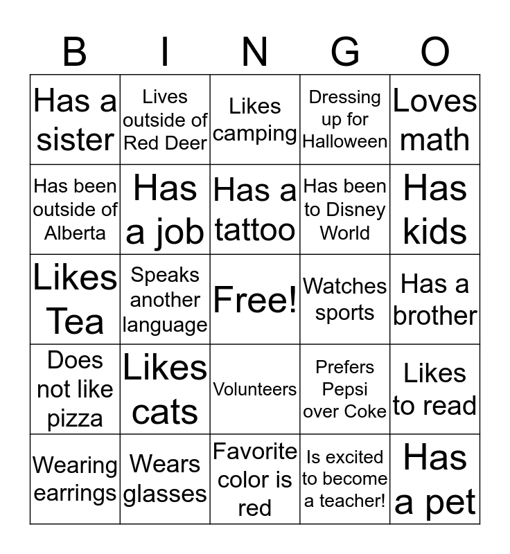 This bingo card has a free space and 24 words: Likes cats, Wears glasses, Has a tattoo, Wearing earrings, Loves math, Has a sister, Has been outside of Alberta, Lives outside of Red Deer, Watches sports, Volunteers, Has been to Disney World, Likes Tea, Prefers Pepsi over Coke, Likes to read, Has a job, Is excited to become a teacher!, Has a brother, Likes camping, Has kids, Speaks another language, Has a pet, Does not like pizza, Dressing up for Halloween and Favorite color is red.