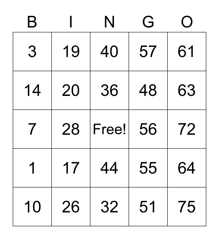This bingo card has a free space and 24 words: 10, 17, 36, 51, 61, 3, 19, 40, 56, 72, 7, 20, 55, 64, 14, 26, 32, 57, 63, 1, 28, 44, 48 and 75.