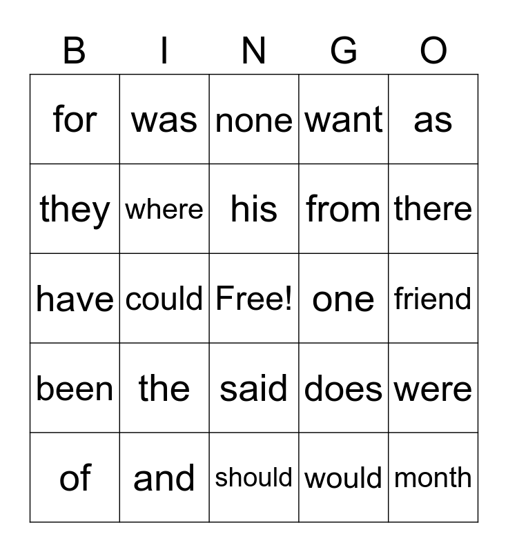 This bingo card has a free space and 24 words: the, and, his, of, as, for, they, was, one, said, from, have, does, were, where, would, friend, none, there, could, month, been, want and should.