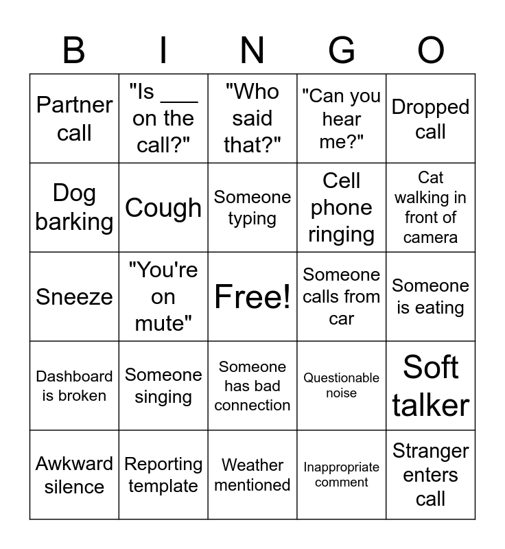 This bingo card has a free space and 24 words: Someone singing, Reporting template, Someone typing, Awkward silence, Dropped call, Partner call, Dog barking, "Is ___ on the call?", Someone calls from car, Someone has bad connection, Cell phone ringing, Sneeze, Questionable noise, Soft talker, Cough, Inappropriate comment, Someone is eating, "Who said that?", Cat walking in front of camera, "You're on mute", Stranger enters call, Dashboard is broken, "Can you hear me?" and Weather mentioned.