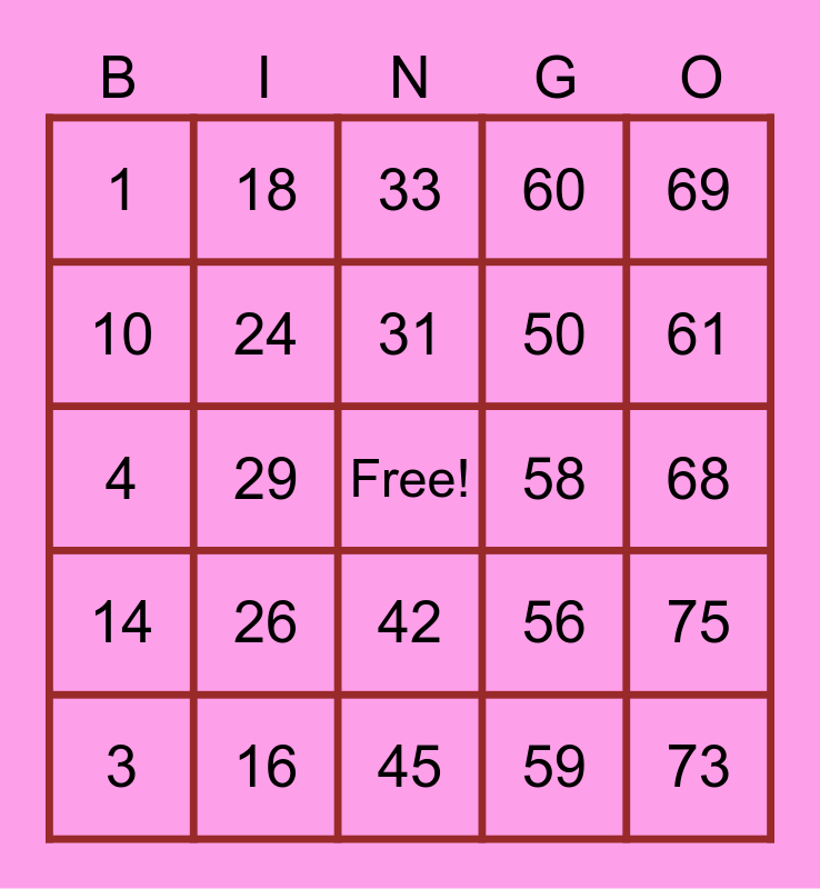 This bingo card has a free space and 24 words: 3, 26, 31, 59, 69, 1, 18, 33, 58, 68, 4, 24, 56, 75, 10, 16, 45, 60, 61, 14, 29, 42, 50 and 73.