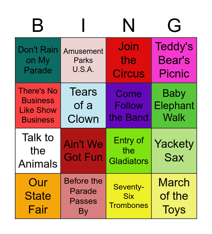 This bingo card has 16 words: Before the Parade Passes By, Yackety Sax, Join the Circus, Don't Rain on My Parade, Talk to the Animals, Amusement Parks U.S.A., Entry of the Gladiators, Seventy-Six Trombones, There's No Business Like Show Business, Tears of a Clown, Our State Fair, Teddy's Bear's Picnic, Ain't We Got Fun, Baby Elephant Walk, Come Follow the Band and March of the Toys.