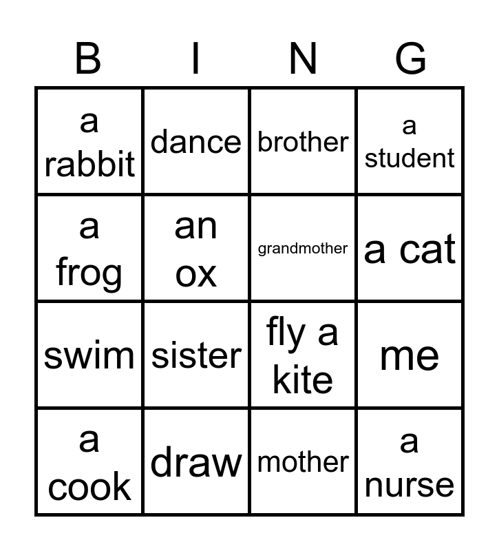 This bingo card has 25 words: Free!, a bird, a cat, a dog, a frog, a rabbit, an ox, dance, draw, sing, swim, fly a kite, ride a bike, grandfather, grandmother, father, mother, brother, sister, me, a cook, a doctor, a nurse, a student and a teacher.