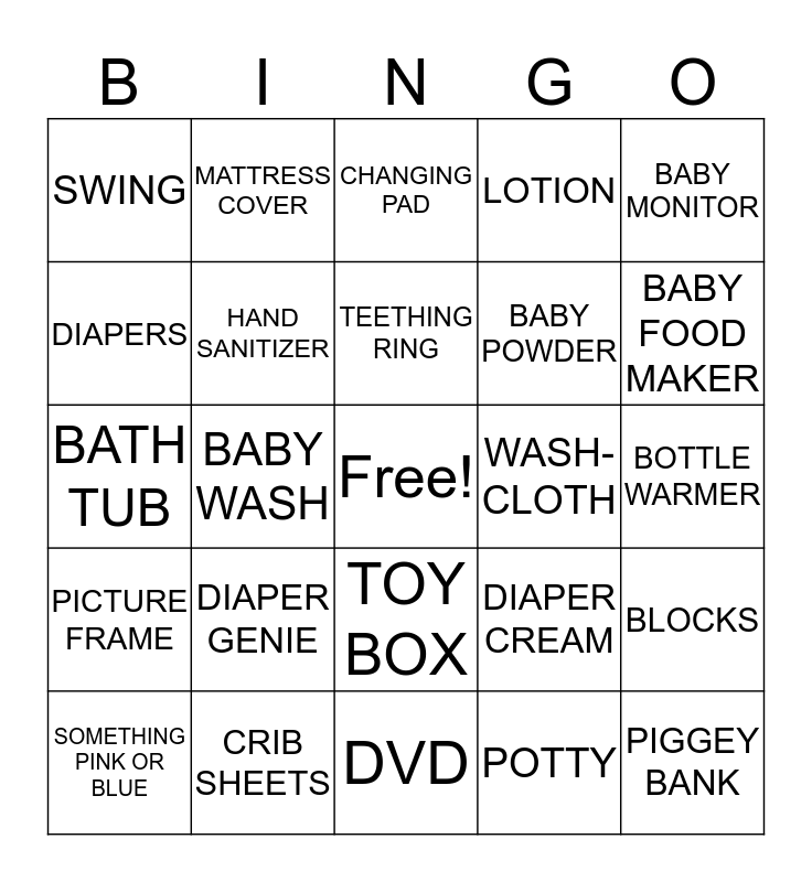 This bingo card has a free space and 73 words: PACIFIER, BOUNCER SEAT, SWING, BURP CLOTHS, DUCKY TOY, SOMETHING GREEN OR YELLOW, PICTURE FRAME, HOODED TOWEL, DIAPER CREAM, ONESIE, CASH, OUTLET PLUGS, HAND SANITIZER, BOTTLE WARMER, BATH TOYS, MATTRESS COVER, DVD, DIAPERS, RATTLE, WASH-CLOTH, TEETHING RING, LOTION, BABY MONITOR, VASELINE, SOMETHING PINK OR BLUE, NASAL ASPIRATOR, PACIFIER, FLEECE BLANKET, STROLLER, PLAYPEN, CRIB SHEETS, MUSICAL TOY, BOARD BOOK, NAIL CLIPPERS, BABY WASH, SLEEPER, BOOTIES, BASSINET, PIGGEY BANK, BREAST PUMP, POTTY, DIAPER GENIE, THERMOMETER, GIFT CARD, DIAPER BAG, BABY POWDER, CHANGING PAD, CAR SEAT, WIPES, BATH TUB, NURSERY DECOR, TEDDY BEAR, HIGH CHAOR, BABY FOOD, MOBILE, PLAY YARD, PHOTO ALBUM, TOY BOX, T-SHIRT, GROOMING KIT, BIB, COTTON SWABS, BABY SPOONS, BABY FOOD MAKER, NIGHT LIGHT, BABY HANGERS, BABY CARRIER / SLING, SWADDLING BLANKET, BLOCKS, BOUNCER CHAIR, HAT, SNOW SUIT and COAT.