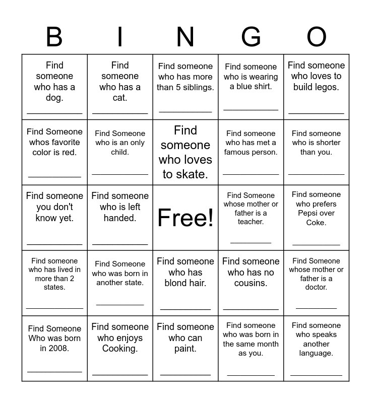 This bingo card has a free space and 29 words: Find Someone Who was born in 2008. ____________, Find Someone who plays an instrument. ___________, Find someone who is left handed. ___________, Find Someone Who likes to Sing. ____________, Find someone who has a dog. ___________, Find someone who has more than 5 siblings. ___________, Find Someone who is an only child. _____________, Find Someone who was born in another state. ___________, Find Someone whose mother or father is a teacher. __________, Find someone who enjoys Cooking. ___________, Find someone who prefers Pepsi over Coke. ___________, Find someone who speaks another language. ____________, Find someone who can paint. __________, Find someone who was born in the same month as you. ___________, Find someone who is shorter than you. _____________, Find someone who has been to Morelos. ___________, Find someone who has blond hair. __________, Find someone who has lived in more than 2 states. ______________, Find someone who loves to build legos. ___________, Find someone you don't know yet. ___________, Find someone who has no cousins. ___________, Find someone who likes coffee. ___________, Find someone who has met a famous person. _____________, Find Someone whos favorite color is red. ___________, Find someone who is wearing a blue shirt. ____________, Find someone who has a cat. ___________, Find Someone whose mother or father is a doctor. __________, Find someone who loves to skate. and Find Someone whos favorite color is purple. ___________.