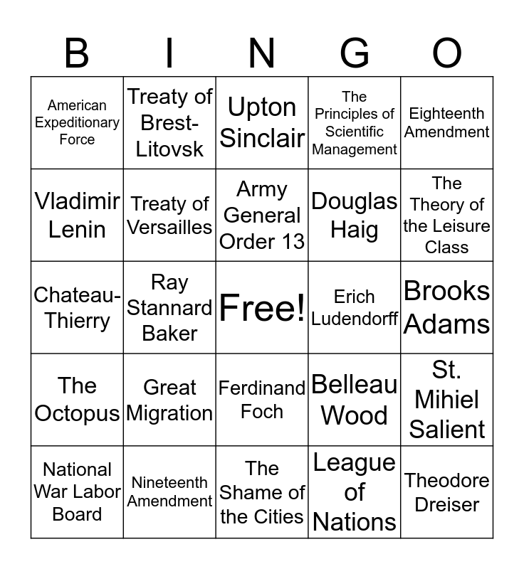 This bingo card has a free space and 24 words: Great Migration, Nineteenth Amendment, Army General Order 13, National War Labor Board, Eighteenth Amendment, American Expeditionary Force, Vladimir Lenin, Treaty of Brest-Litovsk, Erich Ludendorff, Ferdinand Foch, Douglas Haig, Chateau-Thierry, Belleau Wood, St. Mihiel Salient, Treaty of Versailles, League of Nations, Brooks Adams, Upton Sinclair, The Theory of the Leisure Class, Ray Stannard Baker, Theodore Dreiser, The Octopus, The Principles of Scientific Management and The Shame of the Cities.