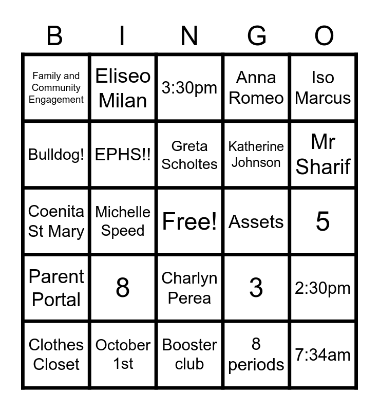 This bingo card has a free space and 24 words: 8, October 1st, Greta Scholtes, Clothes Closet, Iso Marcus, Family and Community Engagement, Bulldog!, Eliseo Milan, Assets, Charlyn Perea, Katherine Johnson, Coenita St Mary, 3, 2:30pm, EPHS!!, 8 periods, 5, 3:30pm, Mr Sharif, Michelle Speed, 7:34am, Parent Portal, Anna Romeo and Booster club.