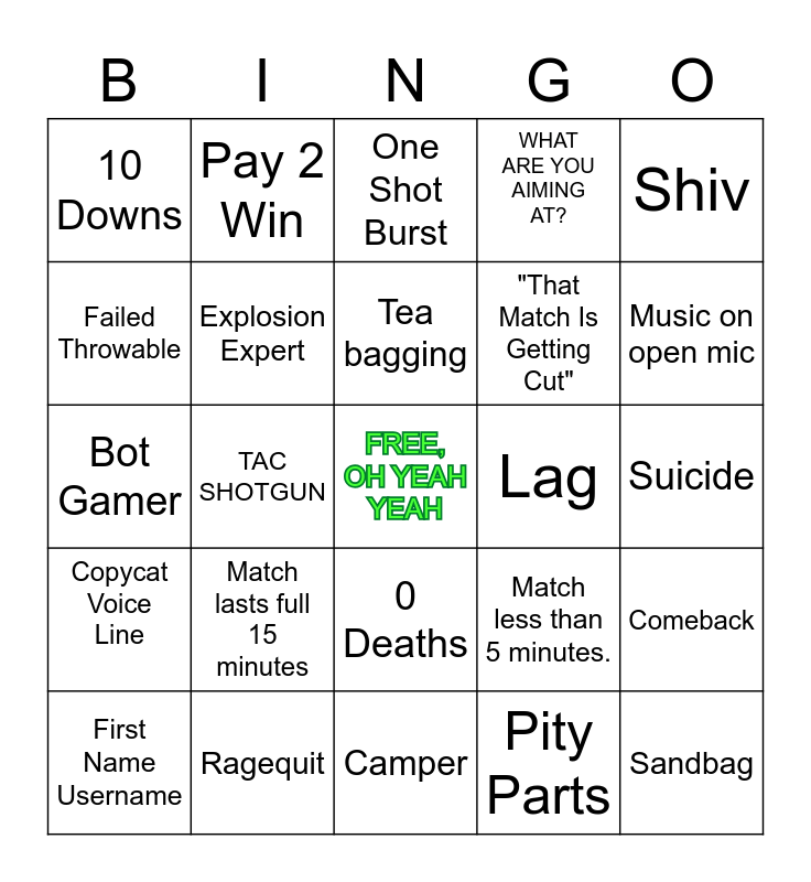 This bingo card has a free space and 24 words: Match lasts full 15 minutes, Ragequit, Tea bagging, First Name Username, Shiv, 10 Downs, Failed Throwable, Pay 2 Win, Lag, 0 Deaths, "That Match Is Getting Cut", Bot Gamer, Match less than 5 minutes., Comeback, Explosion Expert, Pity Parts, Suicide, One Shot Burst, Music on open mic, TAC SHOTGUN, Sandbag, Copycat Voice Line, WHAT ARE YOU AIMING AT? and Camper.