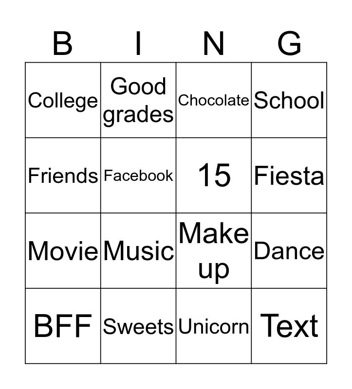 This bingo card has 25 words: Perfume, Love, Fiesta, Ice Cream, Friends, College, Facebook, Good grades, Sweets, Hearts, Movie, Make up, Homework, Cupcake, 15, Ballet, Unicorn, Chocolate, Music, Dance, BFF, Pink, Text, School and Boys.