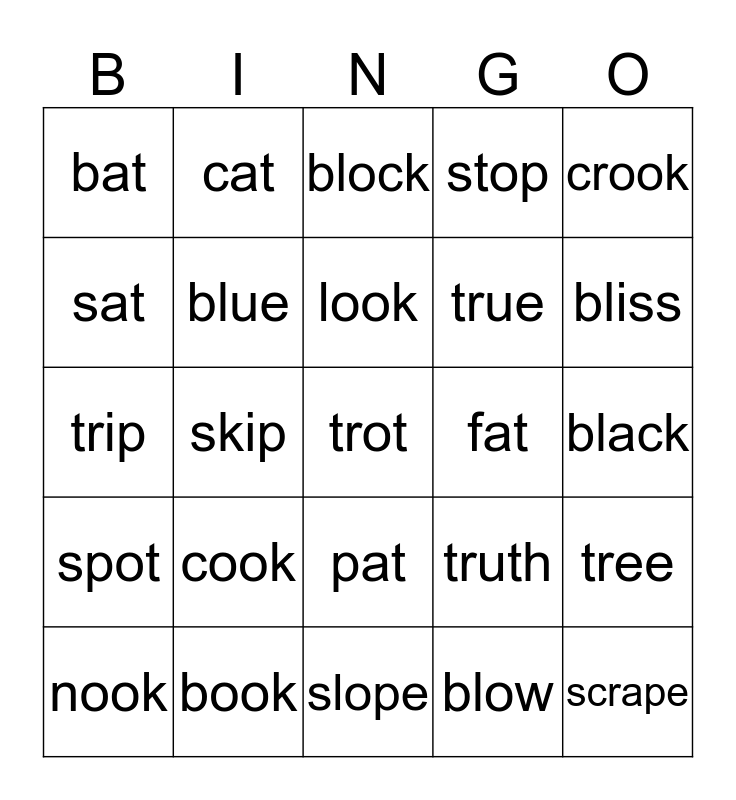 This bingo card has a free space and 24 words: cook, book, look, nook, crook, bat, sat, cat, fat, pat, true, trip, truth, tree, blue, blow, black, block, bliss, skip, scrape, spot, stop and slope.