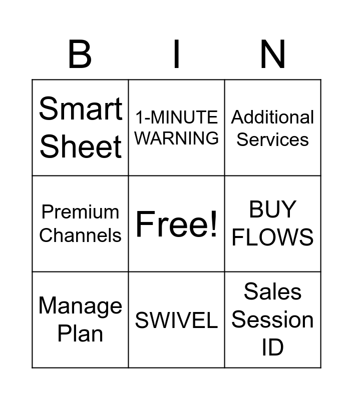 This bingo card has a free space and 24 words: XOE, XFI, SWIVEL, Use chrome, Sales Session ID, Smart Sheet, BUY FLOWS, 1-MINUTE WARNING, QCO (Quick Check Out), 5 TNs, xfinity.com/heatlhcheck, Removing a LOB, CSG, NBX, Manage Plan, XM, XH, Additional Services, Move Plan, Internet, Video, Phone, Premium Channels and Checkout.