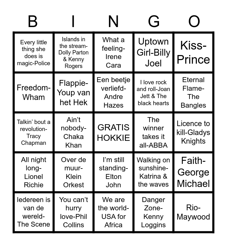This bingo card has a free space and 69 words: I think we’re alone now-Tiffany, Licence to kill-Gladys Knights, Fresh-Kool and the Gang, Down Under-Men at Work, You can’t hurry love-Phil Collins, Red Red Wine-UB40, Uptown Girl-Billy Joel, Come on Eileen-Dexys Midnight Runners, Kiss-Prince, Start me up-Rolling Stones, Faith-George Michael, Our house-Madness, Every little thing she does is magic-Police, What a feeling-Irene Cara, Like a virgin-Madonna, Ain’t nobody-Chaka Khan, I’m still standing-Elton John, I love rock and roll-Joan Jett & The black hearts, 9 to 5-Dolly Parton, All night long-Lionel Richie, The winner takes it all-ABBA, Walking on sunshine-Katrina & the waves, Eternal Flame-The Bangles, Sinds 1 dag of 2-Doe Maar, Stiekem Gedanst-Toontje Lager, Love me just a little bit more-Dolly Dots, Mag het licht uit-De Dijk, Op Fietse-Skik, Danger Zone-Kenny Loggins, (Sittin’on) the dock of the bay-Michael Bolton, Islands in the stream-Dolly Parton & Kenny Rogers, When I see you smile-Bad English, I wanna dance with somebody-Whitney Houston, The way you make me feel-Michael Jackson, La Lamba-Los Lobos, Karma Chameleon-Culture Club, Dancing in the dark-Bruce Springsteen, Livin on a prayer-Bon Jovi, Freedom-Wham, A kind of magic-Queen, Over de muur-Klein Orkest, Rio-Maywood, Als je wint heb je vrienden-Herman Brood, Annabel-Hans de Booij, Nooduitgang-Het goede doel, Iedereen is van de wereld-The Scene, Limburg-Rowwen Heze, Ik voel me zo verdomd alleen-Danny de Munk, Een kopje koffie-VOF de Kunst, Flappie-Youp van het Hek, Een beetje verliefd-Andre Hazes, Pierrot-Bonnie St. Claire, Boer Harm-The dutch boys, We are the world-USA for Africa, Eye of the Tiger-Survivor, Up where we belong-Joe Cocker & Jennifer Warnes, Man in the mirror-Michael Jackson, Moonlight Shadow-Mike Oldifeld, Listen to your heart-Roxette, Talkin’ bout a revolution-Tracy Chapman, Conga!-Miami Sound Machine, We don’t need another hero-Tina Turner, Lambada-Kaoma, We didn’t start the fire-Billy Joel, Manic Monday-The Bangles, Brothers in arms-Dire Straits, Holding out for a hero-Bonnie Tyler, With or without you-U2 and The riddle-Nik Kershaw.