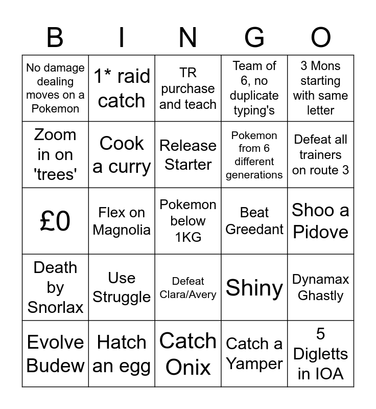 This bingo card has 25 words: Use Struggle, Catch Onix, Release Starter, Evolve Budew, 3 Mons starting with same letter, No damage dealing moves on a Pokemon, Zoom in on 'trees', 1* raid catch, Beat Greedant, Defeat Clara/Avery, Pokemon from 6 different generations, £0, Shiny, Dynamax Ghastly, Cook a curry, 5 Digletts in IOA, Shoo a Pidove, TR purchase and teach, Defeat all trainers on route 3, Flex on Magnolia, Pokemon below 1KG, Hatch an egg, Death by Snorlax, Team of 6, no duplicate typing's and Catch a Yamper.