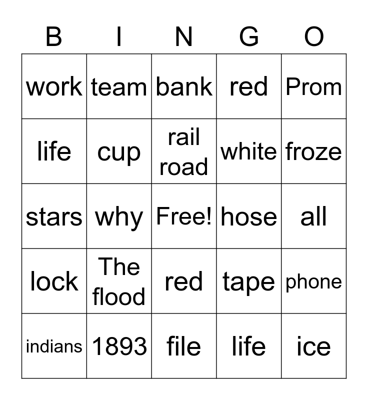This bingo card has a free space and 24 words: The flood, 1893, rail road, indians, Prom, work, life, team, hose, red, white, stars, tape, phone, cup, life, all, bank, froze, why, ice, lock, red and file.