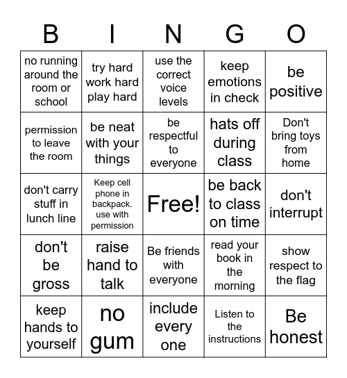 This bingo card has a free space and 24 words: raise hand to talk, no gum, be respectful to everyone, keep hands to yourself, be positive, no running around the room or school, permission to leave the room, try hard work hard play hard, be back to class on time, Be friends with everyone, hats off during class, don't carry stuff in lunch line, read your book in the morning, show respect to the flag, be neat with your things, Listen to the instructions, don't interrupt, use the correct voice levels, Don't bring toys from home, Keep cell phone in backpack. use with permission, Be honest, don't be gross, keep emotions in check and include every one.