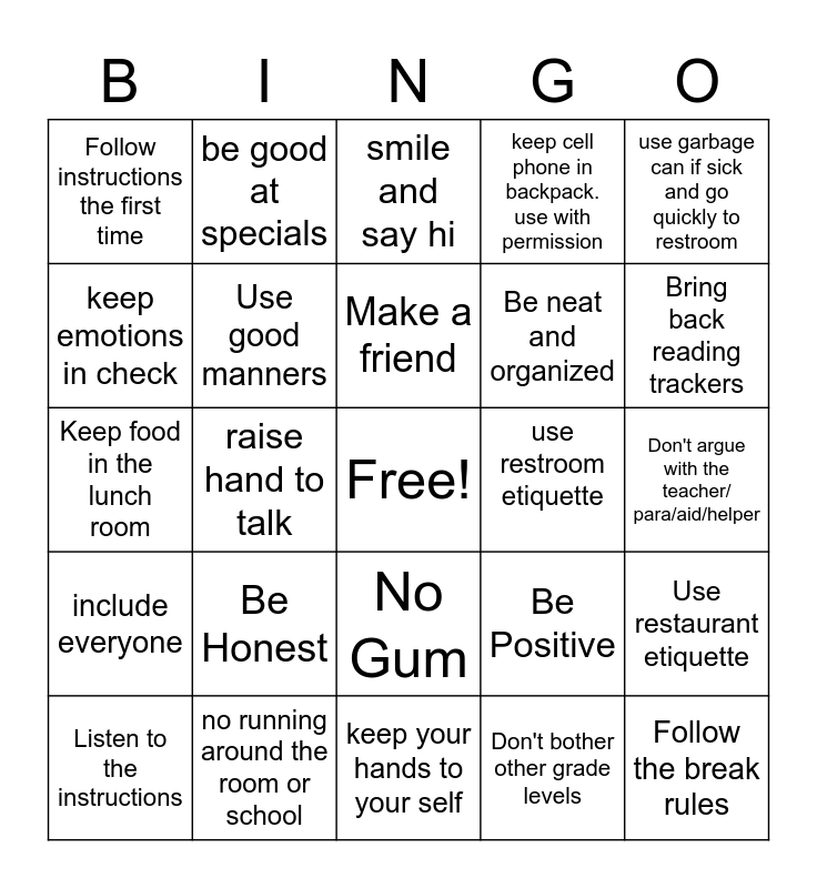 This bingo card has a free space and 24 words: Be Honest, no running around the room or school, Make a friend, Listen to the instructions, use garbage can if sick and go quickly to restroom, Follow instructions the first time, keep emotions in check, be good at specials, use restroom etiquette, No Gum, Be neat and organized, Keep food in the lunch room, Be Positive, Use restaurant etiquette, Use good manners, Don't bother other grade levels, Don't argue with the teacher/ para/aid/helper, smile and say hi, Bring back reading trackers, raise hand to talk, Follow the break rules, include everyone, keep cell phone in backpack. use with permission and keep your hands to your self.