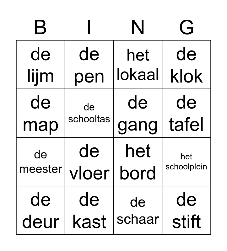 This bingo card has 20 words: het schoolplein, de wc, het lokaal, de gum, de deur, de map, de kast, de lijm, de meester, de pen, de vloer, het bord, de schooltas, de stift, de gang, de lamp, de tafel, de klok, de schaar and de juf.