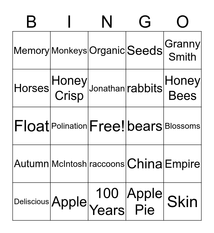 This bingo card has a free space and 24 words: McIntosh, Apple, Jonathan, Deliscious, Granny Smith, Memory, Horses, Monkeys, bears, raccoons, rabbits, Float, China, Empire, Honey Crisp, Apple Pie, Blossoms, Organic, Honey Bees, Polination, Skin, Autumn, Seeds and 100 Years.