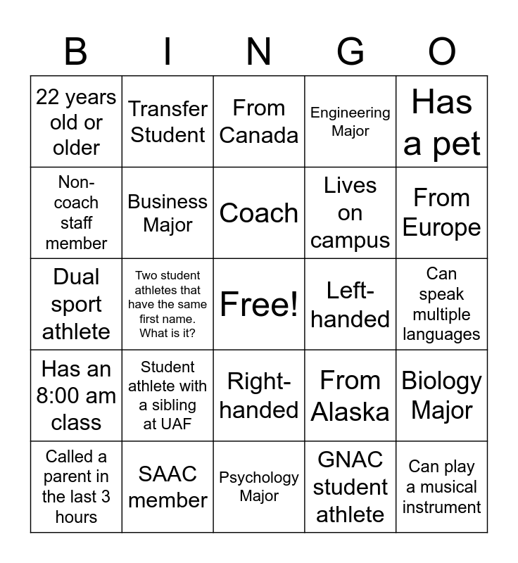 This bingo card has a free space and 24 words: Student athlete with a sibling at UAF, SAAC member, Coach, Called a parent in the last 3 hours, Has a pet, 22 years old or older, Non-coach staff member, Transfer Student, Left-handed, Right-handed, Lives on campus, Dual sport athlete, From Alaska, Biology Major, Business Major, GNAC student athlete, Can speak multiple languages, From Canada, From Europe, Two student athletes that have the same first name. What is it?, Can play a musical instrument, Has an 8:00 am class, Engineering Major and Psychology Major.