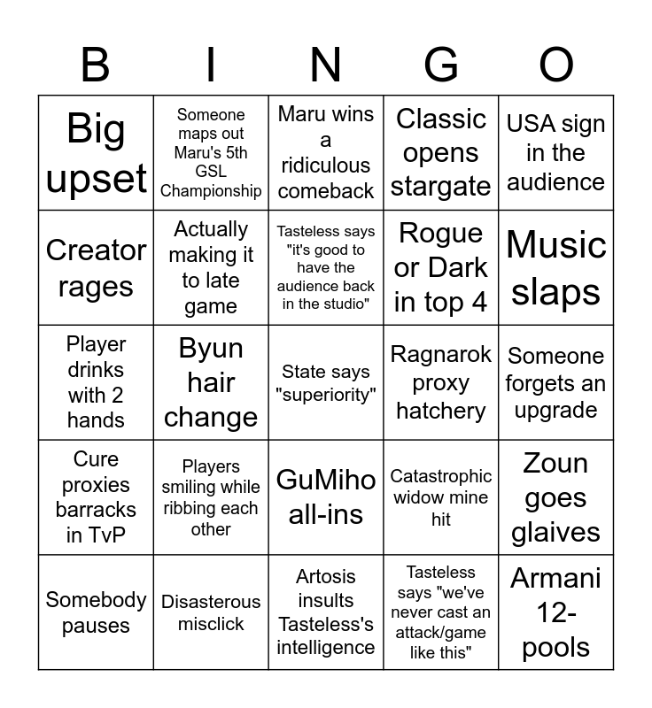 This bingo card has a free space and 24 words: Players smiling while ribbing each other, Disasterous misclick, Tasteless says "it's good to have the audience back in the studio", Somebody pauses, USA sign in the audience, Big upset, Creator rages, Someone maps out Maru's 5th GSL Championship, Ragnarok proxy hatchery, GuMiho all-ins, Rogue or Dark in top 4, Player drinks with 2 hands, Catastrophic widow mine hit, Zoun goes glaives, Actually making it to late game, Tasteless says "we've never cast an attack/game like this", Someone forgets an upgrade, Maru wins a ridiculous comeback, Music slaps, Byun hair change, Armani 12-pools, Cure proxies barracks in TvP, Classic opens stargate and Artosis insults Tasteless's intelligence.