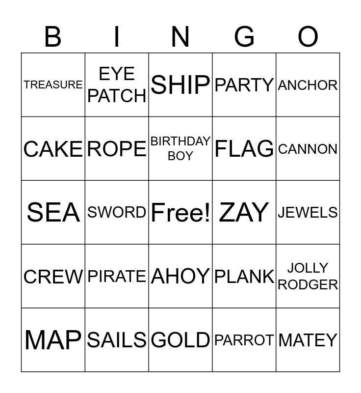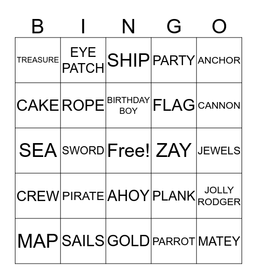 This bingo card has a free space and 24 words: PIRATE, SAILS, BIRTHDAY BOY, MAP, ANCHOR, TREASURE, CAKE, EYE PATCH, ZAY, AHOY, FLAG, SEA, PLANK, JOLLY RODGER, ROPE, PARROT, JEWELS, SHIP, CANNON, SWORD, MATEY, CREW, PARTY and GOLD.