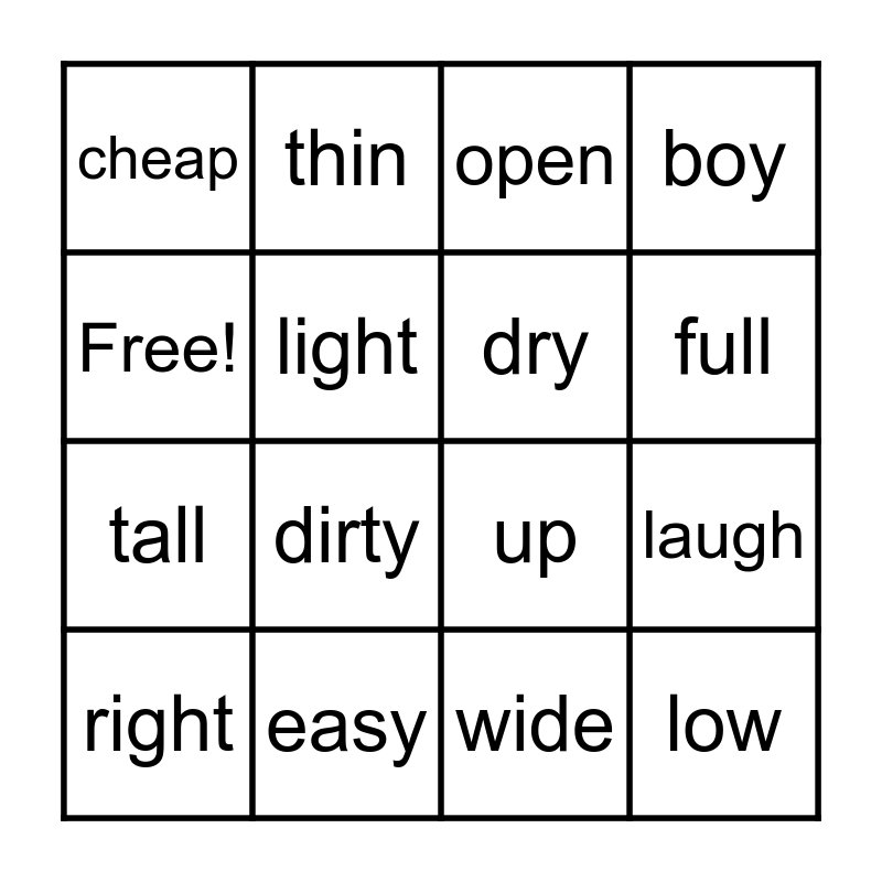This bingo card has 16 words: easy, laugh, open, cheap, tall, thin, up, wide, Free!, light, right, boy, dirty, full, dry and low.