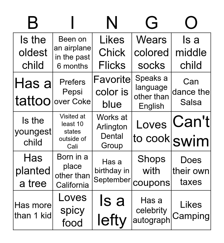 This bingo card has a free space and 24 words: Born in a place other than California, Loves spicy food, Favorite color is blue, Has more than 1 kid, Is a middle child, Is the oldest child, Has a tattoo, Been on an airplane in the past 6 months, Loves to cook, Has a birthday in September, Speaks a language other than English, Is the youngest child, Shops with coupons, Does their own taxes, Prefers Pepsi over Coke, Has a celebrity autograph, Can't swim, Likes Chick Flicks, Can dance the Salsa, Visited at least 10 states outside of Cali, Likes Camping, Has planted a tree, Wears colored socks and Is a lefty.