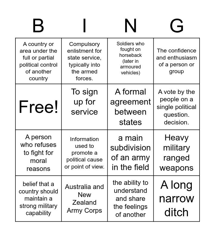 This bingo card has 16 words: Australia and New Zealand Army Corps, Heavy military ranged weapons, Soldiers who fought on horseback (later in armoured vehicles), A country or area under the full or partial political control of another country, A person who refuses to fight for moral reasons, Compulsory enlistment for state service, typically into the armed forces., a main subdivision of an army in the field, the ability to understand and share the feelings of another, Free!, To sign up for service, belief that a country should maintain a strong military capability, The confidence and enthusiasm of a person or group, Information used to promote a political cause or point of view., A vote by the people on a single political question. decision., A formal agreement between states and A long narrow ditch.