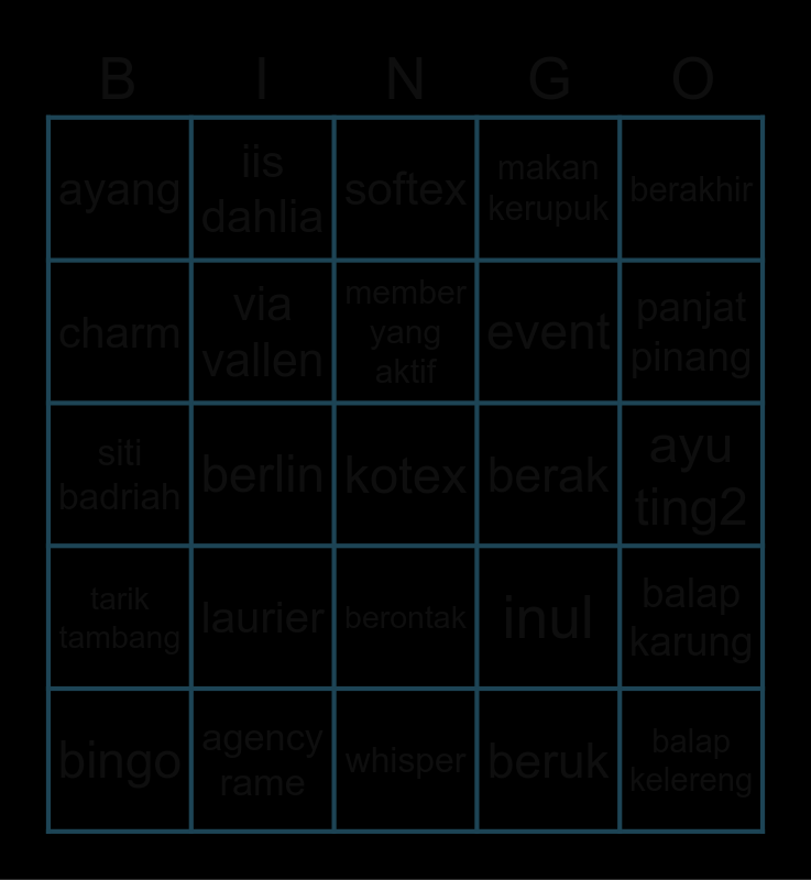 This bingo card has a free space and 24 words: laurier, agency rame, member yang aktif, bingo, berakhir, ayang, charm, iis dahlia, berak, berontak, event, siti badriah, inul, balap karung, via vallen, beruk, ayu ting2, softex, panjat pinang, berlin, balap kelereng, tarik tambang, makan kerupuk and whisper.