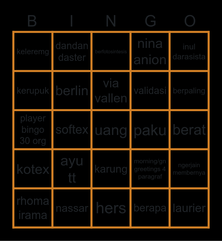 This bingo card has a free space and 24 words: ayu tt, nassar, via vallen, rhoma irama, inul darasista, keleremg, kerupuk, dandan daster, paku, karung, validasi, player bingo 30 org, morning/gn greetings 4 paragraf, ngerjain membernya, berlin, berapa, berat, berfotosintesis, berpaling, softex, laurier, kotex, nina anion and hers.