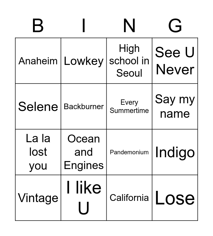 This bingo card has 16 words: I like U, Indigo, High school in Seoul, Anaheim, La la lost you, Lowkey, Pandemonium, California, Selene, Backburner, Vintage, See U Never, Ocean and Engines, Say my name, Every Summertime and Lose.