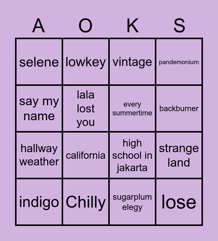 This bingo card has 16 words: Chilly, strange land, vintage, selene, hallway weather, lowkey, high school in jakarta, sugarplum elegy, say my name, lala lost you, indigo, pandemonium, california, backburner, every summertime and lose.