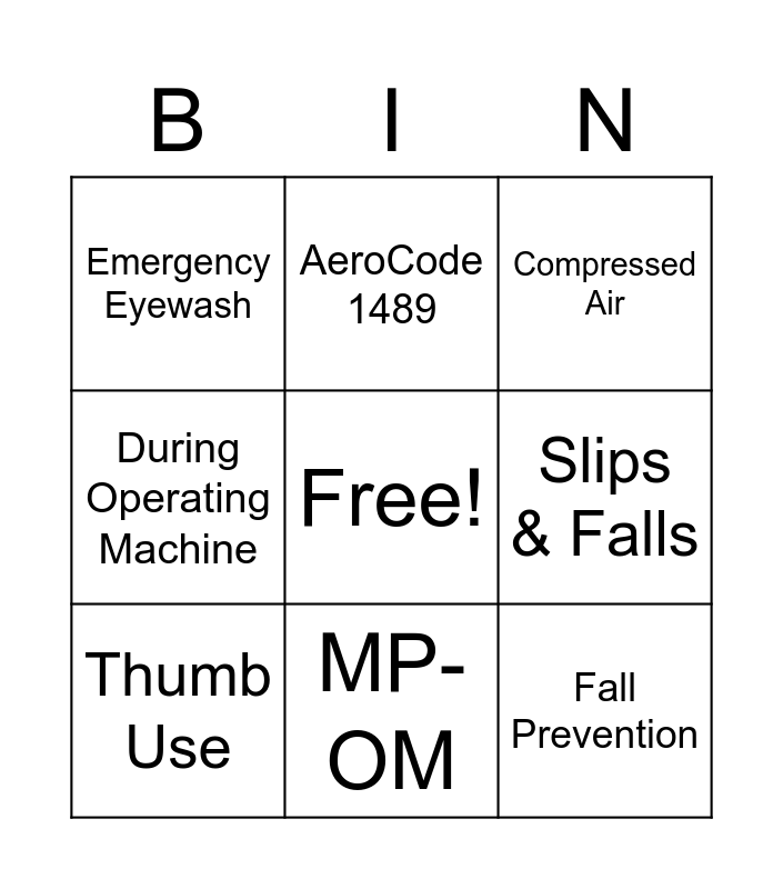 This bingo card has a free space and 11 words: Sun Damage, MP-OM, Fall Prevention, Thumb Use, AeroCode 1489, Compressed Air, Slips & Falls, Before Operating Machine, During Operating Machine, Emergency Eyewash and Lifting Safety.