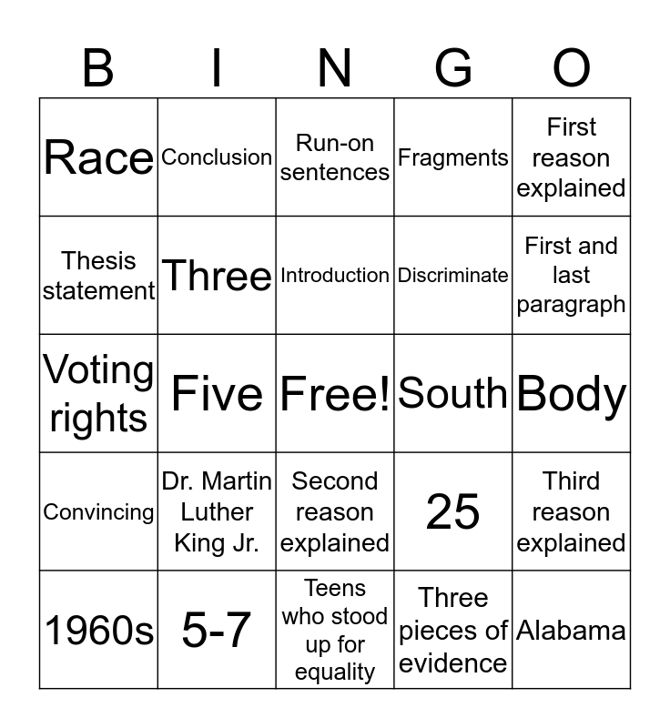 This bingo card has a free space and 24 words: Dr. Martin Luther King Jr., 5-7, Introduction, 1960s, First reason explained, Race, Thesis statement, Conclusion, South, Second reason explained, Discriminate, Voting rights, 25, Third reason explained, Three, Three pieces of evidence, Body, Run-on sentences, First and last paragraph, Five, Alabama, Convincing, Fragments and Teens who stood up for equality.