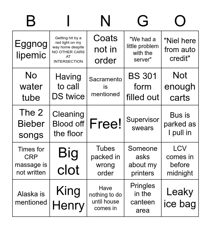 This bingo card has a free space and 24 words: Big clot, King Henry, Sacramento is mentioned, Alaska is mentioned, "Niel here from auto credit", Eggnog lipemic, No water tube, Getting hit by a red light on my way home despite NO OTHER CARS AT INTERSECTION, Supervisor swears, Tubes packed in wrong order, BS 301 form filled out, The 2 Bieber songs, Someone asks about my printers, LCV comes in before midnight, Having to call DS twice, Pringles in the canteen area, Bus is parked as I pull in, Coats not in order, Not enough carts, Cleaning Blood off the floor, Leaky ice bag, Times for CRP massage is not written, "We had a little problem with the server" and Have nothing to do until house comes in.