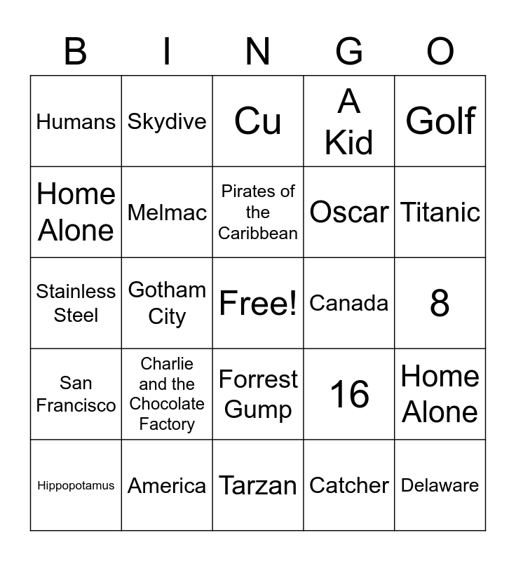 This bingo card has a free space and 29 words: Hippopotamus, Benjamin Franklin, Gotham City, Catcher, Humans, Cu, Melmac, Charlie and the Chocolate Factory, Canada, America, 8, Delaware, Tarzan, Catcher, Titanic, Abraham Lincoln, Forrest Gump, San Francisco, Golf, Stainless Steel, 16, Mercury, Oscar, Home Alone, A Kid, Skydive, Home Alone, Pirates of the Caribbean and 2007.