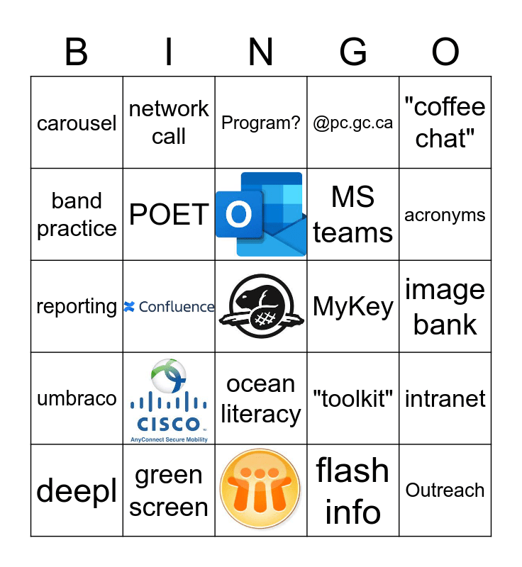 This bingo card has 4 images, a free space and 20 words: green screen, deepl, "coffee chat", carousel, band practice, network call, MyKey, ocean literacy, MS teams, reporting, "toolkit", intranet, POET, flash info, image bank, Program?, acronyms, Outreach, umbraco and @pc.gc.ca.