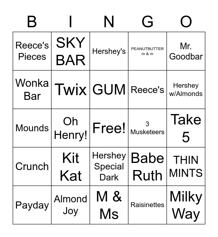 This bingo card has a free space and 29 words: Payday, Snickers, Oh Henry!, Skybar, Reece's Pieces, Hershey's, Twix, Kit Kat, 3 Musketeers, Almond Joy, Take 5, Milky Way, M & Ms, Raisinettes, Hershey w/Almonds, Chunky, Hershey Special Dark, Crunch, Mr. Goodbar, Mounds, Babe Ruth, Butterfinger, Reece's, Wonka Bar, PEANUTBUTTER m & m, SKY BAR, THIN MINTS, GUM and SQUIRREL CANDY.