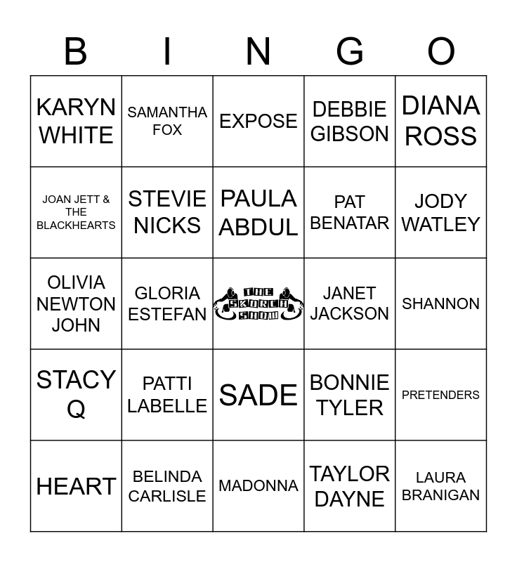 This bingo card has a free space and 24 words: PATTI LABELLE, BELINDA CARLISLE, PAULA ABDUL, HEART, DIANA ROSS, KARYN WHITE, JOAN JETT & THE BLACKHEARTS, SAMANTHA FOX, JANET JACKSON, SADE, PAT BENATAR, OLIVIA NEWTON JOHN, BONNIE TYLER, PRETENDERS, STEVIE NICKS, TAYLOR DAYNE, SHANNON, EXPOSE, JODY WATLEY, GLORIA ESTEFAN, LAURA BRANIGAN, STACY Q, DEBBIE GIBSON and MADONNA.