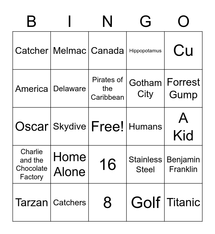 This bingo card has a free space and 29 words: Tarzan, San Francisco, Skydive, 2007, Catcher, Canada, Delaware, Home Alone, Humans, Catchers, A Kid, Titanic, 8, Golf, Forrest Gump, Mercury, 16, Charlie and the Chocolate Factory, Cu, Oscar, Stainless Steel, Abraham Lincoln, Gotham City, America, Hippopotamus, Melmac, Benjamin Franklin, Pirates of the Caribbean and IT.