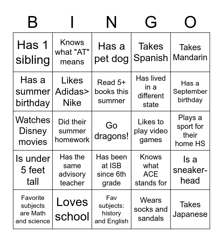 This bingo card has a free space and 24 words: Has the same advisory teacher, Loves school, Read 5+ books this summer, Favorite subjects are Math and science, Takes Mandarin, Has 1 sibling, Has a summer birthday, Knows what "AT" means, Likes to play video games, Has been at ISB since 6th grade, Has lived in a different state, Watches Disney movies, Knows what ACE stands for, Is a sneaker- head, Likes Adidas> Nike, Wears socks and sandals, Plays a sport for their home HS, Has a pet dog, Has a September birthday, Did their summer homework, Takes Japanese, Is under 5 feet tall, Takes Spanish and Fav subjects: history and English.