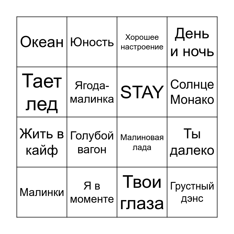 This bingo card has 16 words: Я в моменте, Ты далеко, Хорошее настроение, Океан, Жить в кайф, Юность, Малиновая лада, Твои глаза, Тает лед, Ягода-малинка, Малинки, День и ночь, Голубой вагон, Солнце Монако, STAY and Грустный дэнс.
