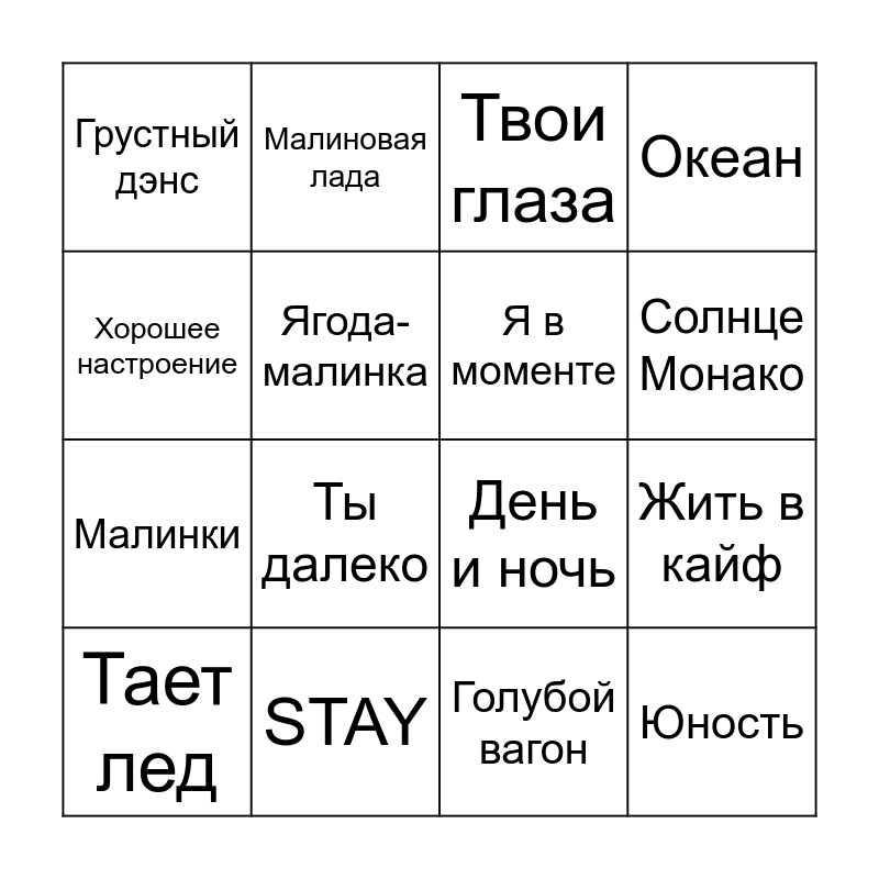This bingo card has 16 words: STAY, Жить в кайф, Твои глаза, Грустный дэнс, Малинки, Малиновая лада, День и ночь, Голубой вагон, Хорошее настроение, Ягода-малинка, Тает лед, Океан, Ты далеко, Солнце Монако, Я в моменте and Юность.