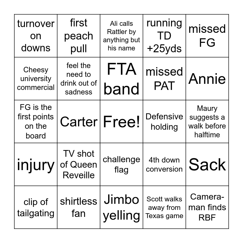 This bingo card has a free space and 24 words: TV shot of Queen Reveille, shirtless fan, FTA band, clip of tailgating, missed FG, turnover on downs, Cheesy university commercial, first peach pull, Defensive holding, challenge flag, missed PAT, FG is the first points on the board, 4th down conversion, Sack, feel the need to drink out of sadness, Scott walks away from Texas game, Maury suggests a walk before halftime, Ali calls Rattler by anything but his name, Annie, Carter, Camera-man finds RBF, injury, running TD +25yds and Jimbo yelling.
