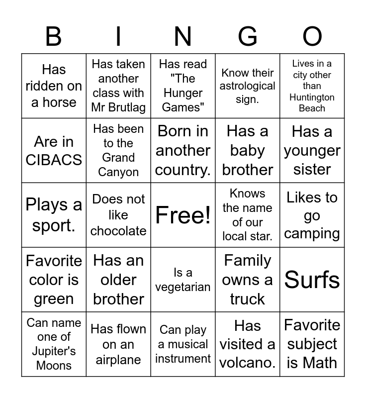 This bingo card has a free space and 29 words: Knows the planets in order., Has flown on an airplane, Has read "The Hunger Games", Has more than one pet, Lives in a city other than Huntington Beach, Has ridden on a horse, Has been to the Grand Canyon, Born in another country., Knows the name of our local star., Surfs, Can name one of Jupiter's Moons, Does not like chocolate, Has visited a volcano., Favorite subject is Math, Plays a sport., Has lived in more than one state, Can play a musical instrument, Family owns a truck, Has a younger sister, Favorite color is green, Has an older brother, Likes to skateboard, Has a baby brother, Likes to go camping, Are in CIBACS, Has taken another class with Mr Brutlag, Is a vegetarian, Know their astrological sign. and Family owns and electric vehicle..