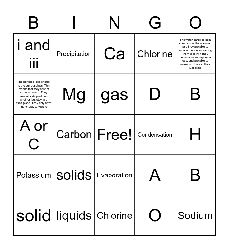 This bingo card has a free space and 24 words: solids, liquids, gas, solid, The water particles gain energy from the warm air and they are able to escape the forces holding them together/They become water vapour, a gas, and are able to move into the air. They evaporate., i and iii, The particles lose energy to the surroundings. This means that they cannot move so much. They cannot slide past one another, but stay in a fixed place. They only have the energy to vibrate, Precipitation, Condensation, Evaporation, D, A or C, A, B, Mg, O, H, Ca, B, Carbon, Sodium, Potassium, Chlorine and Chlorine.